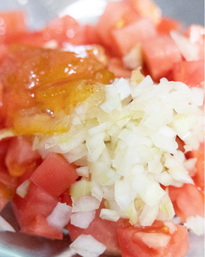 - 2. 玉ねぎはみじん切りにして、水にさらし、水気を絞っておく。