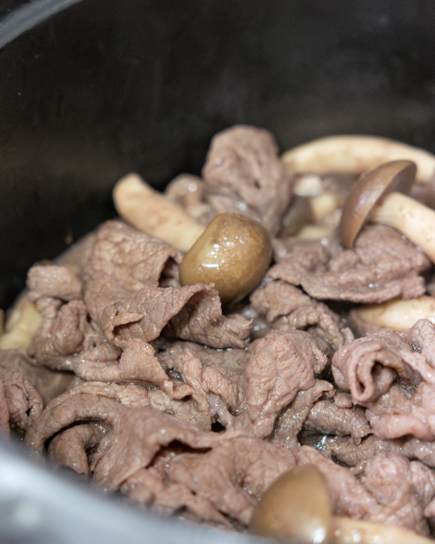 - 1. 鍋にサラダ油を熱して牛肉としめじを軽く炒めて、色が変わったら一旦取り出しておく。