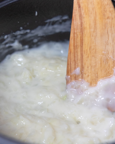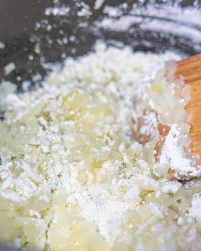 - 2. 鍋をペーパータオルでふき、バターを敷いてみじん切りにした玉ねぎを炒め、透き通ってきたら小麦粉を加えて、粉っ気がなくなるまで弱火で炒める。