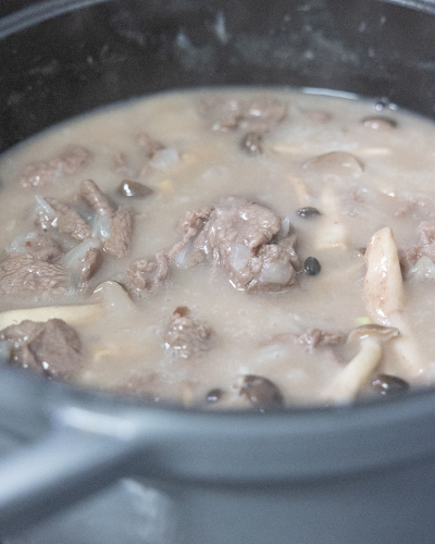 - 3. ダマができないようにヘラで混ぜながらチキンスープを少しずつ加え(この時の火加減は弱火)その後、牛肉としめじを戻し入れる。